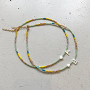 Add a pop of color to your outfit with the LC Studio Alphabet Beaded Necklace. This unique piece features colorful beads and mother pearl alphabet charms. Perfect for any occasion.