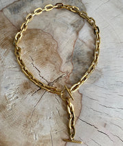 This 18 karat gold-plated stainless Chain with medium size links and T-bar pendant it is a classic  design that balances minimalism and statement dressing.  Perfect on a white t-shirt for a 80's look of wear it  with your favourite dress for a more classic look.
