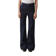 St. Monica is a bold sailor pant style infused with Jeanerica’s DNA, completed with patch pockets on the front and back. Features a super high-rise and bold, flared leg. The jeans are primarily made from organic cotton blended with recycled polyester and limited amount of elastane. This special combination developed by Jeanerica gives the garment an effortless stretch that retains the shape over time.