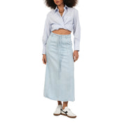 Second Female Irvin Skirt is made in soft light weight denim with tonal stitching. Featuring a concealed zip, hook and button fastening inside waistband. Fabric tie belt at waist. Two slanted pockets. Shaped yoke at back. Fitted seams at back. Slim fit with slight A-shape. Per it with Irving Shirt and Summerstories boyfriend shirt for a total look.