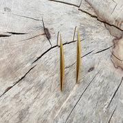 Gold plated minimal elegant long spike drop earrings a wardrobe essentials with a model edge.